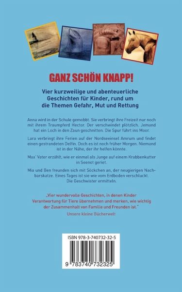 Vier kurzweilige und abenteuerliche Geschichten für Kinder rund um die Themen Gefahr, Mut und RettungAnna wird in der Schule gemobbt. Sie zieht sich zurück und verbringt ihre Freizeit nur noch mit ihrem Traumpferd, dem Haflinger-Wallach Hector. Ausgerechnet ihre Gegenspielerin Lena fängt auf demselben Reiterhof mit dem Voltigieren an. Plötzlich verschwindet Hector. Jemand hat ein Loch in den Zaun geschnitten. Lena folgt der Spur ins Moor.Lara verbringt ihre Ferien auf der Nordseeinsel Amrum. Auf dem Rückweg vom Brötchenholen geht sie kurz zum Meer. Sie findet einen gestrandeten Delfin. Doch es ist noch zu früh. Niemand ist in der Nähe, der ihr helfen könnte. Mia und Ben dürfen keine Katze haben. Das Problem löst sich, als eine neue Nachbarin in die Straße zieht. Schnell freundet sich das Geschwisterpaar mit Söckchen, einer neugierigen Katze an. Eines Tages ist sie wie vom Erdboden verschluckt. Mia und Ben werden von der Nachbarin als Detektive engagiert und ermitteln.Auf einer Fahrradtour erzählt Max' Vater von einem Abenteuer aus seiner Kindheit. Vor vielen Jahren fuhr er mit Opa auf einen Krabbenkutter von Dorum aus aufs Meer. Dann schlägt das Wetter um. Ein Seil blockiert die Schiffschraube, der Kutter läuft auf einer Untiefe auf und schlägt leck. Ein Kampf gegen die Zeit beginnt.