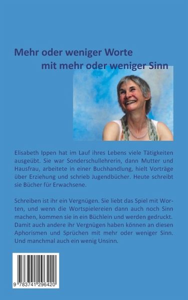 Elisabeth Ippen, geboren 1951, studierte Pädagogik für Sonderschulen, lebte dreißig Jahre in Bonn, zunächst als Mutter und Hausfrau, schrieb dann nebenher Jugendbücher und hielt an verschiedenen Bildungseinrichtungen Vorträge über Erziehung. Seit 2011 lebt sie als Autorin im Chiemgau. Seither erschienen: Ganz unverblümt. Sprüche und Aphorismen 2011 Zum Glück in Prien. Ein Neubeginn 2013 Der Weg ist das Ziel. Unterwegs in Süddeutschland 2014 Hanne - eine Rheinländerin im Chiemgau 2015 Ganz unverblümt 2. Sprüche und Aphorismen 2016 elisabeth.ippen@web.de