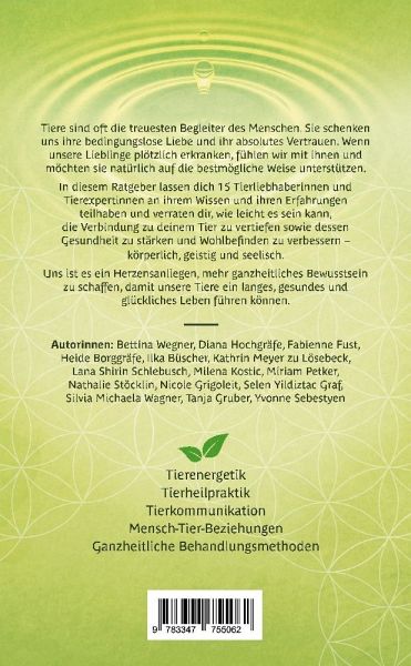 Tiere sind oft die treuesten Begleiter des Menschen. Sie schenken uns ihre bedingungslose Liebe und ihr absolutes Vertrauen. Wenn unsere Lieblinge plötzlich erkranken, fühlen wir mit ihnen und möchten sie natürlich auf die bestmögliche Weise unterstützen. In diesem Ratgeber lassen dich 15 Tierliebhaberinnen und Tierexpertinnen an ihrem Wissen und ihren Erfahrungen teilhaben und verraten dir, wie leicht es ist, die Verbindung zu deinem Tier zu vertiefen sowie dessen Gesundheit zu verbessern und Wohlbefinden zu stärken - körperlich, geistig und seelisch. Uns ist es ein Herzensanliegen, mehr…mehr