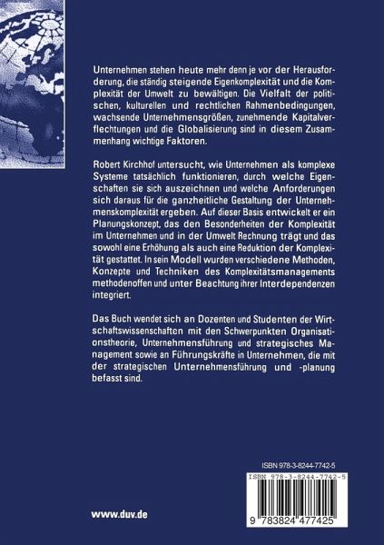 Robert Kirchhof untersucht, wie Unternehmen als komplexe Systeme tatsächlich funktionieren, durch welche Eigenschaften sie sich auszeichnen und welche Anforderungen sich daraus für die ganzheitliche Gestaltung der Unternehmenskomplexität ergeben. Auf dieser Basis entwickelt er ein Planungskonzept, das den Besonderheiten der Komplexität im Unternehmen und in der Umwelt Rechnung trägt und das sowohl eine Erhöhung als auch eine Reduktion der Komplexität gestattet. In sein Modell wurden verschiedene Methoden, Konzepte und Techniken des Komplexitätsmanagements methodenoffen und unter Beachtung ihrer Interdependenzen integriert.