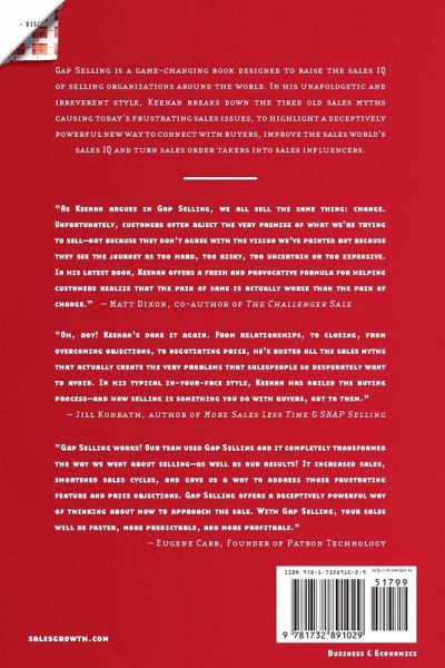 People don't buy from people they like. No! Your buyer doesn't care about you or your product or service. It's not your job to overcome objections, it's your buyer's. Closing isn't a skill of good salespeople; it's the skill of weak salespeople. Price isn't the main reason salespeople lose the sale. Gap Selling shreds traditional and closely held sales beliefs that have been hurting salespeople for decades. For years, salespeople have embraced a myriad of sales tactics and belief systems that have unknowingly created many of the issues they have been trying to avoid such as: long sales cycles, price objections, no decision, prospects going dark, last minute feature requests, and more. Success at sales requires more than a set of tactics. Salespeople need to understand the game of sales, how sales works, and what the buyer is going through in order to make the decision to buy (change) or not to buy (not change). Gap Selling is a game-changing book designed to raise the sales IQ of selling organizations around the world. In his unapologetic and irreverent style, Keenan breaks down the tired old sales myths causing today's frustrating sales issues, to highlight a deceptively powerful new way to connect with buyers. Today's sales world is littered with glorified order takers, beholden to a frustrated buyer, unable to influence the sale and create value. Gap Selling flips the script and creates salespeople with immense influence at every stage of the buying process, capable of impacting the sales metrics that matter: Shorter Sales Cycles Increased Revenue Elevated Deal Values Higher Win Rates Fewer No Decisions More Leads And Happier Buyers Gap Selling elevates the sales world's selling IQ and turns sales order takers into sales influencers.