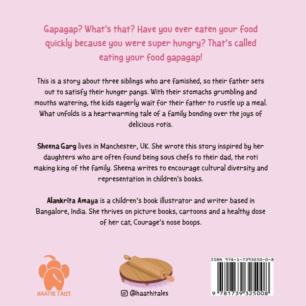 Gapagap? What's that? Have you ever eaten your food quickly because you were super hungry? That's called eating your food gapagap! This is a story about three siblings who are famished, so their father sets out to satisfy their hunger pangs. With their stomachs grumbling and mouths watering, the kids eagerly wait for their father to rustle up a meal. What unfolds is a heartwarming tale of a family bonding over the joys of delicious rotis. This children's picture book is ideal for 0 to 6 year olds to develop their Hindi language skills. It creates the opportunity to learn Hindi vocabulary - words such as 'aakaar' which means shapes and fun phrases such as 'pet mein choohe kood rahe hain' which refers to hunger pangs! The English transliteration of Hindi Devanagari script helps English-speakers to easily read aloud the story while also learning Hindi.