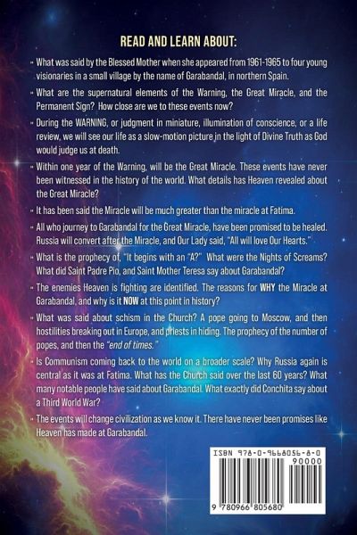 Garabandal is a book about the great HOPE coming to humanity in the not to distant future. Although no date is precisely mentioned, events are much closer as we look at the state of the world, and the moral slide of humanity. The Warning, the Great Miracle, and the Permanent Sign are like three acts all in the same play that will all happen in no more than one year once the Warning happens. It is the ultimate act of Mercy and Grace for humanity. For those who follow Garabandal, it is obvious the prophecies that were given to four young girls in northern Spain from 1961-65, are events the world has never seen before. The Warning is where everyone in the world at the same time will have an "illumination of conscience" where they will see the state of their soul where they will see the state of their soul where God would judge them at their death. After that will appear a Great Miracle at the nine pines of Garabandal. These events have never been seen in the world before, and will not be explained by science. It is an enjoyable read from start to finish where the reader will feel genuine hope when they finish the book. No prophecies have even been given like these in Church history. God is in control. Read and learn about:What was said by the Blessed Mother when she appeared from 1961-1965 to four young visionaries in a small village by the name of Garabandal, in northern Spain. What are the supernatural elements of the Warning, the Great Miracle, and the Permanent Sign? How close are we to these events now? During the WARNING, or judgment in miniature, illumination of conscience, or a life review, we will see our life as a slow-motion picture in the light of Divine Truth as God would judge us at death. Within one year of the Warning, will be the Great Miracle. These events have never been witnessed in the history of the world. What details has Heaven revealed about the Great Miracle? It has been said the Miracle will be much greater than the miracle at Fatima. All who journey to Garabandal for the Great Miracle, have been promised to be healed. Russia will convert after the Miracle, and Our Lady said, "All will love Our Hearts." What is the prophecy of, "It begins with an "A?" What were the Nights of Screams? What did Saint Padre Pio, and Saint Mother Teresa say about Garabandal? The enemies Heaven is fighting are identified. The reasons for WHY the Miracle at Garabandal, and why is it NOW at this point in history? What was said about schism in the Church? A pope going to Moscow, and then hostilities breaking out in Europe, and priests in hiding. The prophecy of the number of popes, and then the "end of times." Is Communism coming back to the world on a broader scale? Why Russia again is central as it was at Fatima. What has the Church said over the last 60 years? What many notable people have said about Garabandal. What exactly did Conchita say about a Third World War? The events will change civilization as we know it. There have never been promises like Heaven has made at Garabandal.