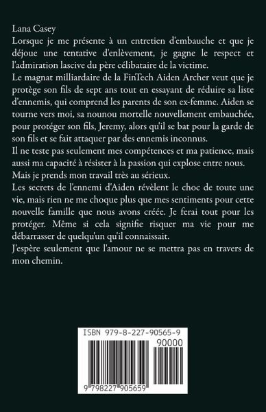 Lana Casey Lorsque je me présente à un entretien d'embauche et que je déjoue une tentative d'enlèvement, je gagne le respect et l'admiration lascive du père célibataire de la victime. Le magnat milliardaire de la FinTech Aiden Archer veut que je protège son fils de sept ans tout en essayant de réduire sa liste d'ennemis, qui comprend les parents de son ex-femme. Aiden se tourne vers moi, sa nounou mortelle nouvellement embauchée, pour protéger son fils, Jeremy, alors qu'il se bat pour la garde de son fils et se fait attaquer par des ennemis inconnus. Il ne teste pas seulement mes compétences et ma patience, mais aussi ma capacité à résister à la passion qui explose entre nous. Mais je prends mon travail très au sérieux. Les secrets de l'ennemi d'Aiden révèlent le choc de toute une vie, mais rien ne me choque plus que mes sentiments pour cette nouvelle famille que nous avons créée. Je ferai tout pour les protéger. Même si cela signifie risquer ma vie pour me débarrasser de quelqu'un qu'il connaissait. J'espère seulement que l'amour ne se mettra pas en travers de mon chemin.