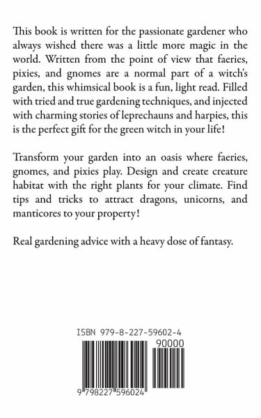 This book is written for the passionate gardener who always wished there was a little more magic in the world. Written from the point of view that faeries, pixies, and gnomes are a normal part of a witch's garden, this whimsical book is a fun, light read. Filled with tried and true gardening techniques, and injected with charming stories of leprechauns and harpies, this is the perfect gift for the green witch in your life! Transform your garden into an oasis where faeries, gnomes, and pixies play. Design and create creature habitat with the right plants for your climate. Find tips and tricks to attract dragons, unicorns, and manticores to your property! Real gardening advice with a heavy dose of fantasy.