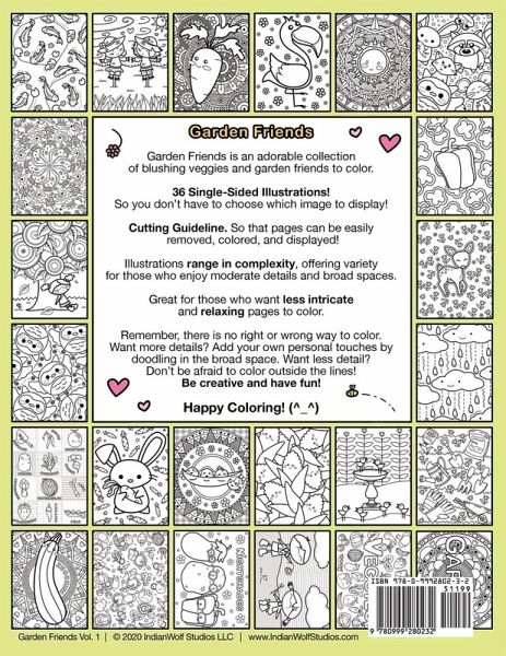 Garden Friends Volume 1 is an adorable collection ¿of blushing veggies and garden friends to color. 36 Single-Sided Illustrations! So you don't have to choose which image to display! Cutting Guideline. So that pages can be easily removed, colored, and displayed! Illustrations range in complexity, offering variety ¿for those who enjoy moderate details and broad spaces. Great for those who want less intricate and relaxing pages to color. Remember, there is no right or wrong way to color. Want more details? Add your own personal touches by doodling in the broad space. Want less detail? Don't be afraid to color outside the lines!¿ Be creative and have fun! Printed on: 8.5"x11" 70 lb White Paper Happy Coloring! (^_^)