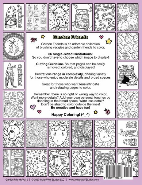 Garden Friends Volume 2 is an adorable collection of blushing veggies and garden friends to color. 36 Single-Sided Illustrations! So you don't have to choose which image to display! Cutting Guideline. So that pages can be easily removed, colored, and displayed! Illustrations range in complexity, offering variety for those who enjoy moderate details and broad spaces. Great for those who want less intricate and relaxing pages to color. Remember, there is no right or wrong way to color. Want more details? Add your own personal touches by doodling in the broad space. Want less detail? Don't be afraid to color outside the lines! Be creative and have fun! Printed on: 8.5"x11" 70 lb White Paper Happy Coloring! (^_^)