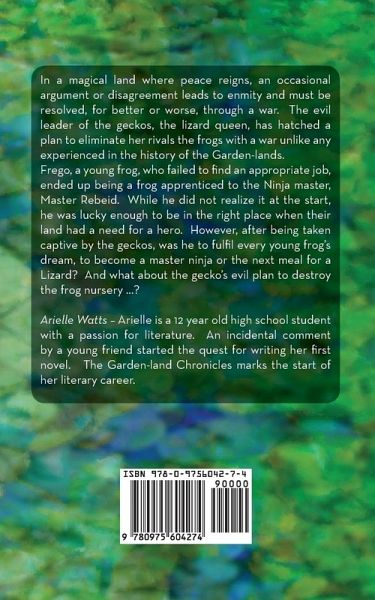 In a magical land where peace reigns, an occasional argument or disagreement leads to enmity and must be resolved, for better or worse, through a war. The evil leader of the geckos, the lizard queen, has hatched a plan to eliminate her rivals the frogs with a war unlike any experienced in the history of the Garden-lands. Frego, a young frog, who failed to find an appropriate job, ended up being a frog apprenticed to the Ninja master, Master Rebeid. While he did not realise it at the start, he was lucky enough to be in the right place when their land had a need for a hero. However, after being taken captive by the geckos, was he to fulfil every young frog's dream, to become a master ninja or the next meal for a Lizard? And what about the gecko's evil plan to destroy the frog nursery ...? Arielle Watts - Arielle is a 12 year old high school student with a passion for literature. An incidental comment by a young friend started the quest for writing her first novel. The Garden-land Chronicles marks the start of her literary career.
