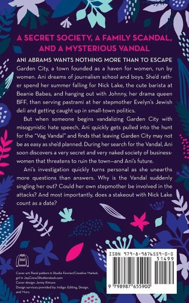 A secret society, a family scandal, and a mysterious vandal Ani Abrams wants nothing more than to escape Garden City, a town founded as a haven for women, run by women. Ani dreams of journalism school and boys. She'd rather spend her summer falling for Nick Lake, the cute barista at Beanie Babes, and hanging out with Johnny, her drama queen BFF, than serving pastrami at her stepmother Evelyn's Jewish deli and getting caught up in small town politics. But when someone begins vandalizing Garden City with misogynistic hate speech, Ani quickly gets pulled into the hunt for the Vag Vandal and finds that leaving Garden City may not be as easy as she'd planned. During her search for the Vandal, Ani soon discovers a very secret and very naked society of businesswomen that threatens to ruin the town-and Ani's future. Ani's investigation quickly turns personal as she unearths more questions than answers. Why is the Vandal suddenly singling her out? Could her own stepmother be involved in the attacks? And most importantly, does a stakeout with Nick Lake count as a date?