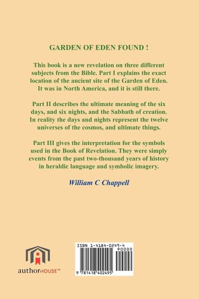 This book entitled, Garden of Eden Found, is divided into three almost equal parts. Part I of the book is exactly what the title says. It reveals and explains the exact geographical location of the ancient site of the Garden of Eden. This is an absolutely new and a previously undiscovered site. People suppose that we must yet wait on a prophet of God to reveal its location, but this book explains that God through the prophet Moses said everything he could to explain the location of the Garden of Eden in the second chapter of Genesis. It is just that the names of the lands and rivers have changed. The original thing in this work, however, is that the ancient site of the Garden of Eden was located upon the North American continent. Note that according to Genesis 1:10 each land was called earth. Thus, it could have been on any continent. There has never been one fact of evidence to show that the Garden of Eden was located in the Middle East anyway. This has only been a supposition of the so-called learned; even those who write the text books; and most of whom do not believe in God or in revelation. The author has simply put together the Genesis account of Eden with the latter-day revelations concerning Adam-ondi-Ahman in America. Part II of this book reveals the ultimate meaning of the six days and the six nights and Sabbath of the creation account in Genesis chapter one. No one has ever discovered nor understood their ultimate meaning before this work. The author submits that this concept is the greatest concept that can be conceived by the mind of man concerning ultimate reality. This concept ties together the law of eternal progression, the order of the universes of the cosmos, and the days and nights of creation as one and the same thing. So the author begins Part II of his book with the following paragraph. If I were a scientist and was speaking before my other colleagues, then, I would name my address, "The Number and Order of the Universes of the Cosmos." If I was a philosopher and was presenting this topic before my fellow philosophers, I would entitle my presentation, "The Law of Eternal Progression to Ultimate Continuum." But if I happened to be a theologian, and was preaching a sermon to my parishioners, I would call my message, "The Meaning of the Six Days and Six Nights and a Sabbath of Creation." This is because these three subjects concern the same ultimate reality. The first is scientific, the second is philosophical, and the third is religious. Often the terms for universe and the cosmos are used interchangeably. Actually, this is the concept of mankind at the present time. Most people, including scientists, the philosophers, and the theologians, consider that the universe is the cosmos and that the cosmos is the universe. However, this is simply not the true case of the matter, for the cosmos is the sum total of the series of the twelve universes of the cosmos. However, would anyone have ever entertained the idea that the answer is to be found in the first chapter of the Book of Genesis in the Bible? Who would have thought that God had hidden it in the simple account of the six days and the six nights and Sabbath of creation? I will attempt to show, in plainness and simplicity, that this is the true interpretation. Part III of this book explains the historic meaning of the symbolism in the Book of Revelation. The new truth to understand is that they represent only natural things and historical events of the past two-thousand years of Christian history. There are three general principles that we must accept in order to understand the symbolism of the Book of Revelation. Let me now list the general principles in this order. The first thing to understand is that the prophecy of the Book of Revelation covers the past two-thousand years of western history. The second thing to understand is that the prophecy is only about Christianity.