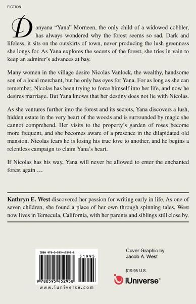 Danyana "Yana" Morneen, the only child of a widowed cobbler, has always wondered why the forest seems so sad. Dark and lifeless, it sits on the outskirts of town, never producing the lush greenness she longs for. As Yana explores the secrets of the forest, she tries in vain to keep an admirer's advances at bay. Many women in the village desire Nicolas Vanlock, the wealthy, handsome son of a local merchant, but he only has eyes for Yana. For as long as she can remember, Nicolas has been trying to force himself into her life, and now he desires marriage. But Yana knows that her destiny does not lie with Nicolas. As she ventures further into the forest and its secrets, Yana discovers a lush, hidden estate in the very heart of the woods and is surrounded by magic she cannot comprehend. Her visits to the property's garden of roses become more frequent, and she becomes aware of a presence in the dilapidated old mansion. Nicolas fears he is losing his true love to another, and he begins a relentless campaign to claim Yana's heart. If Nicolas has his way, Yana will never be allowed to enter the enchanted forest again .