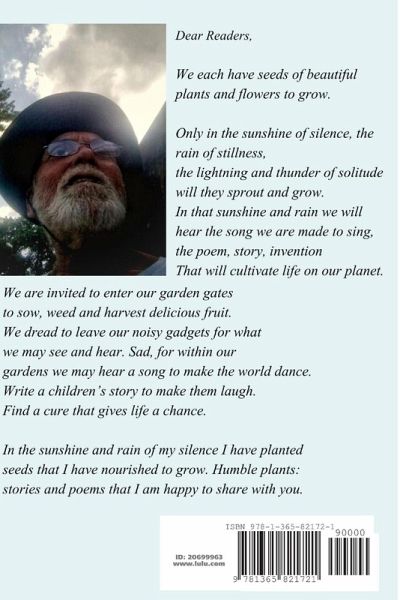 We each have seeds of beautiful plants and flowers to grow. Only in the sunshine of silence, the rain of stillness, the lightning and thunder of solitude will they sprout and grow. In that sunshine and rain we will hear the song we are made to sing, the poem, story, invention That will cultivate life on our planet. We are invited to enter our garden gates to sow, weed and harvest delicious fruit. We dread to leave our noisy gadgets for what we may see and hear. Sad, for within our gardens we may hear a song to make the world dance. Write a children's story to make them laugh. Find a cure that gives life a chance. In the sunshine and rain of my silence I have planted seeds that I have nourished to grow. Humble plants: stories and poems that I am happy to share with you.