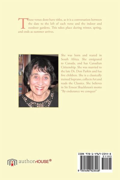 These verses dont have titles, as it is a conversation between the date to the left of each verse and the indoor and outdoor gardens.This takes place during winter,spring, and ends as summer arrives.I should like to have the dates in a different print, so to speak, to highlight them as they are an important feature of the conversation. Also one verse per page, there are 48 of them.