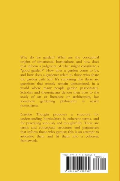 Why do we garden? What are the conceptual origins of ornamental horticulture, and how does that inform a judgment of what might constitute a "good garden?" How does a garden come to be, and how does a gardener relate to those who share the garden with her? It's surprising that these are questions that mostly remain unexamined, in a world where many people garden passionately. Scholars and theoreticians devote their lives to the study of art or literature or architecture, but somehow gardening philosophy is nearly nonexistent. Garden Thought proposes a structure for understanding horticulture in coherent terms, and for practicing seriously and thoughtfully. There are terms and conceptual structures and parameters that inform those who garden; this is an attempt to articulate them and fit them into a coherent framework.