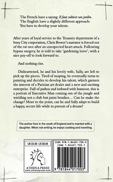 The French have a saying: Il faut cultiver son jardin. The English have a slightly different approach: You have to develop your talents. After years of loyal service to the Treasury department of a busy City corporation, Chris Bower's narrator is forced out of the rat race after an unexpected heart attack. Following bypass surgery, he is told to take 'gardening leave', with a nice pay-off to look forward to. And nothing else. Disheartened, he and his lovely wife, Sally, are left to pick up the pieces. Tired of moping, he eventually turns to painting and decides to develop his talent, which garners the interest of a Parisian art dealer and a new and exciting enterprise. Full of pathos and imbued with humour, this is a portrait of Executive Man coming out of the jungle and wielding not a club but paint brushes. Can he make the change? More to the point, can he and Sally adapt to build a happy, secure life while in pursuit of a dream?
