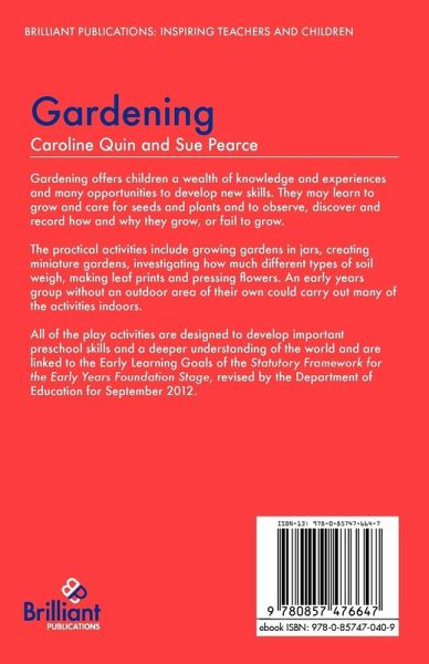 Gardening offers children a wealth of knowledge and experiences and many opportunities to develop new skills. They may learn to grow and care for seeds and plants and to observe, discover and record how and why they grow, or fail to grow. The practical activities include growing gardens in jars, creating miniature gardens, investigating how much different types of soil weigh, making leaf prints and pressing fl owers. An early years group without an outdoor area of their own could carry out many of the activities indoors. All of the play activities are designed to develop important preschool skills and a deeper understanding of the world and are linked to the Early Learning Goals of the Statutory Framework for the Early Years Foundation Stage, revised by the Department of Education for September 2012.