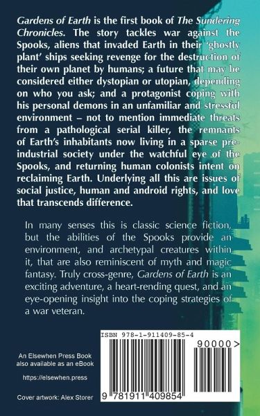 Imagine an alien life force that knows your deepest fear, and can use that against you. Corporate greed supported by incompetent surveyors leads to the colonisation of a distant world, ominously dubbed 'Halloween', that turns out not to be uninhabited after all. The aliens, soon called Spooks by military units deployed to protect the colonists, can adopt the physical form of an opponent's deepest fear and then use it to kill them. The colony is massacred and as retaliation the orbiting human navy nuke the planet. In revenge, the Spooks invade Earth. In a last-minute attempt to avert the war, Seethan Bodell, a marine combat pilot sent home from the front with PTSD, is given a top-secret research spacecraft, and a mission to travel into the past along with his co-pilot and secret lover Rose, to prevent the original landing on Halloween and stop the war from ever happening. But the mission goes wrong, causing a tragedy later known as The Sundering, decimating the world and tearing reality, while Seethan's ship is flung into the future. The Spooks win the war and claim ownership of Earth. He wakes, alone, in his ejector seat with no sign of either Rose or his vessel. When he realises that his technology no longer works, his desperation to find Rose becomes all the more urgent - her android body won't survive long in this new Earth. Gardens of Earth is the first book of The Sundering Chronicles. The story tackles alien war, a future that may be considered either dystopian or utopian, depending on who you ask, and a protagonist coping with his demons in an unfamiliar and stressful environment - not to mention immediate threats from a pathological serial killer, the remnants of Earth's inhabitants now living in a sparse pre-industrial society under the watchful eye of the Spooks, and returning human colonists intent on reclaiming Earth. Underlying all this are issues of social justice, human and android rights, and love that transcends difference. In many senses this is classic science fiction, but the abilities of the Spooks provide an environment, and archetypal creatures within it, that are reminiscent of myth and magic fantasy. Truly cross-genre, Gardens of Earth is an exciting adventure, a heart-rending quest, and an eye-opening insight into the coping strategies of a veteran. Cover artwork by Alex Storer