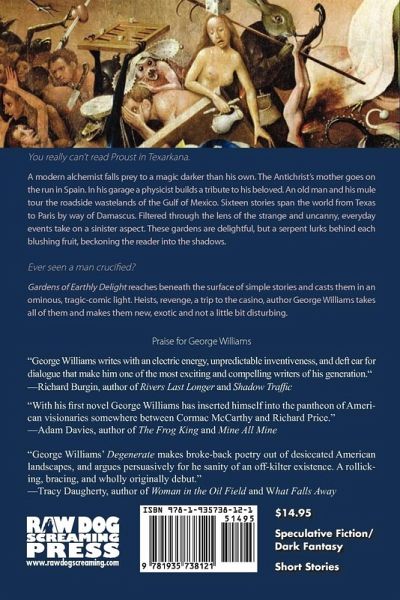 A modern alchemist falls prey to a magic darker than his own. The Antichrist's mother goes on the run in Spain. In his garage a physicist builds a tribute to his beloved. An old man and his mule tour the roadside wastelands of the Gulf of Mexico. Sixteen stories span the world from Texas to Paris by way of Damascus. Filtered through the lens of the strange and uncanny, everyday events take on a sinister aspect. These gardens are delightful, but a serpent lurks behind each blushing fruit, beckoning the reader into the shadows. GARDENS OF EARTHLY DELIGHT reaches beneath the surface of simple stories and casts them in an ominous, tragic-comic light. Heists, revenge, a trip to the casino, author George Williams takes all of them and makes them new, exotic and not a little bit disturbing.