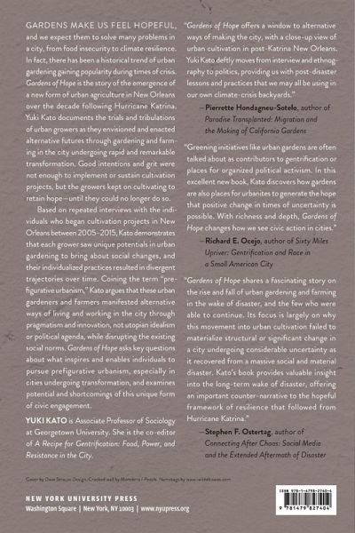 Gardens of Hope is the story of urban gardening in New Orleans in the decade after Hurricane Katrina. Kato highlights the impact urban gardens have on communities after disasters and the efforts of well-intended individuals envisioning alternative futures in the form of urban farming.