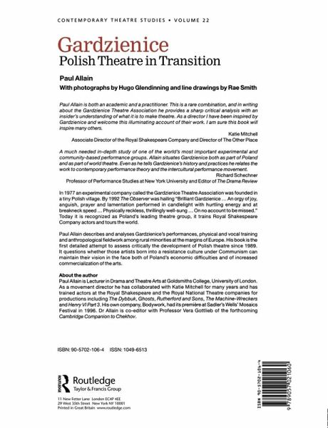 In 1977, the Gardzienice Theatre Association, an experimental theatre company was founded in a tiny Polish village. By 1992 The Observer was hailing "Brilliant Gardzienice...and orgy of joy, anguish, prayer and lamentation performed in candlelight with hurtling energy and at breakneck speed...Physically reckless, thrillingly well sung...On no account to be missed. " Today the Gardzienice Theatre Association is hailed as Poland's leading theatre group, training Royal Shakespeare Company actors and touring the world. Paul Allain describes and analyses their sung performances, strenuous physical and vocal training, and anthropological fieldwork amongst marginalized European minorities. This is one of the first detailed attempts to assess developments in Polish experimental theatres since 1989. The author questions whether those artists can maintain their vision in the face of Poland's economic difficulties and increased commercialization of the arts.