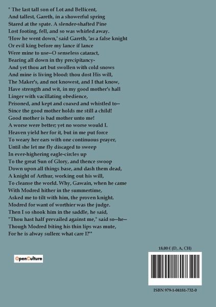 " The last tall son of Lot and Bellicent, And tallest, Gareth, in a showerful spring Stared at the spate. A slender-shafted Pine Lost footing, fell, and so was whirled away. 'How he went down,' said Gareth, 'as a false knight Or evil king before my lance if lance Were mine to use--O senseless cataract, Bearing all down in thy precipitancy- And yet thou art but swollen with cold snows And mine is living blood: thou dost His will, The Maker's, and not knowest, and I that know, Have strength and wit, in my good mother's hall Linger with vacillating obedience, Prisoned, and kept and coaxed and whistled to-- Since the good mother holds me still a child! Good mother is bad mother unto me! A worse were better; yet no worse would I. Heaven yield her for it, but in me put force To weary her ears with one continuous prayer, Until she let me fly discaged to sweep In ever-highering eagle-circles up To the great Sun of Glory, and thence swoop Down upon all things base, and dash them dead, A knight of Arthur, working out his will, To cleanse the world. Why, Gawain, when he came With Modred hither in the summertime, Asked me to tilt with him, the proven knight. Modred for want of worthier was the judge. Then I so shook him in the saddle, he said, "Thou hast half prevailed against me," said so--he-- Though Modred biting his thin lips was mute, For he is alway sullen: what care I?'"