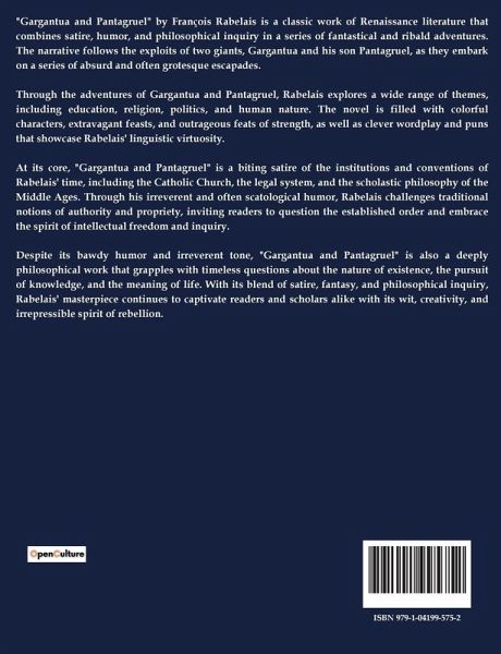 "Gargantua and Pantagruel" by François Rabelais is a classic work of Renaissance literature that combines satire, humor, and philosophical inquiry in a series of fantastical and ribald adventures. The narrative follows the exploits of two giants, Gargantua and his son Pantagruel, as they embark on a series of absurd and often grotesque escapades. Through the adventures of Gargantua and Pantagruel, Rabelais explores a wide range of themes, including education, religion, politics, and human nature. The novel is filled with colorful characters, extravagant feasts, and outrageous feats of strength, as well as clever wordplay and puns that showcase Rabelais' linguistic virtuosity. At its core, "Gargantua and Pantagruel" is a biting satire of the institutions and conventions of Rabelais' time, including the Catholic Church, the legal system, and the scholastic philosophy of the Middle Ages. Through his irreverent and often scatological humor, Rabelais challenges traditional notions of authority and propriety, inviting readers to question the established order and embrace the spirit of intellectual freedom and inquiry. Despite its bawdy humor and irreverent tone, "Gargantua and Pantagruel" is also a deeply philosophical work that grapples with timeless questions about the nature of existence, the pursuit of knowledge, and the meaning of life. With its blend of satire, fantasy, and philosophical inquiry, Rabelais' masterpiece continues to captivate readers and scholars alike with its wit, creativity, and irrepressible spirit of rebellion.