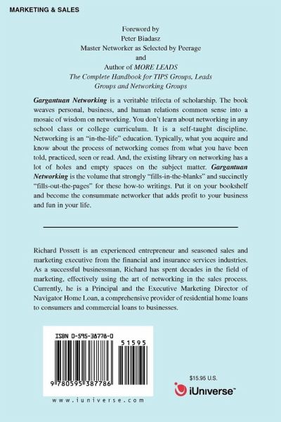 Foreword by Peter Biadasz Master Networker as Selected by Peerage And Author of MORE LEADS The Complete Handbook for TIPS Groups, Leads Groups and Networking Groups Gargantuan Networking is a veritable trifecta of scholarship. The book weaves personal, business, and human relations common sense into a mosaic of wisdom on networking. You don't learn about networking in any school class or college curriculum. It is a self-taught discipline. Networking is an "in-the-life" education. Typically, what you acquire and know about the process of networking comes from what you have been told, practiced, seen or read. And, the existing library on networking has a lot of holes and empty spaces on the subject matter Gargantuan Networking is the volume that strongly "fills-in-the-blanks" and succinctly "fills-out-the-pages" for these how-to writings. Put it on your bookshelf and become the consummate networker that adds profit to your business and fun in your life.