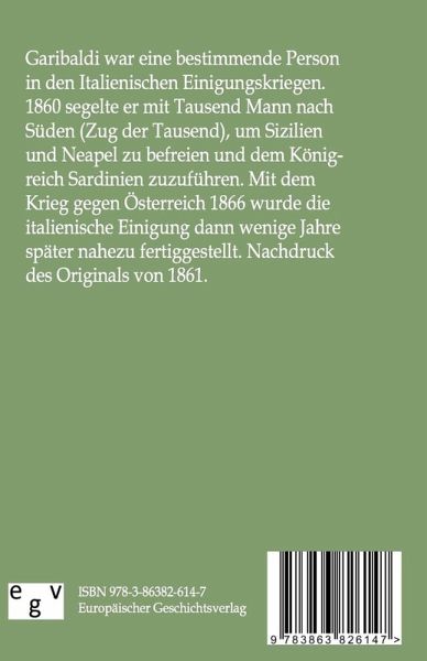 Garibaldi war eine bestimmende Person in den Italienischen Einigungskriegen. 1860 segelte er mit Tausend Mann nach Süden (Zug der Tausend), um Sizilien und Neapel zu befreien und dem Königreich Sardinien zuzuführen. Mit dem Krieg gegen Österreich 1866 wurde die italienische Einigung dann wenige Jahre später nahezu fertiggestellt. Nachdruck des Originals von 1861.