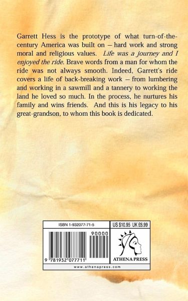 Garrett Hess is the prototype of what turn-of-the-century America was built on-hard work and strong moral and religious values. Life was a journey and I enjoyed the ride. Brave words from a man for whom the ride was not always smooth. Indeed, Garrett's ride covers a life of back-breaking work-from lumbering and working in a sawmill and a tannery to working the land he loved so much. In the process, he nurtures his family and wins friends. And this is his legacy to his great-grandson, to whom this book is dedicated.