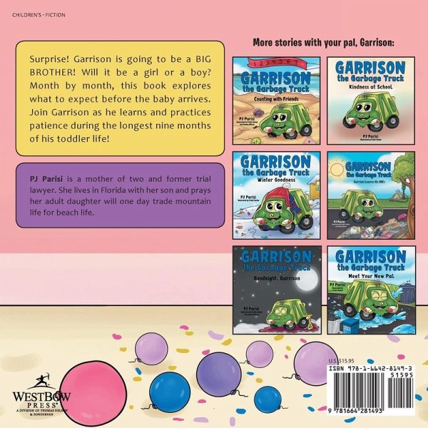 Surprise! Garrison is going to be a BIG BROTHER! Will it be a girl or a boy? Month by month, this book explores what to expect before the baby arrives. Join Garrison as he learns and practices patience during the longest nine months of his toddler life!
