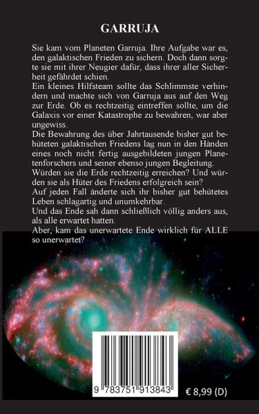 GARRUJASie kam vom Planeten Garruja. Ihre Aufgabe war es, den galaktischen Frieden zu sichern. Doch dann sorgte sie mit ihrer Neugier dafür, dass ihrer aller Sicherheit gefährdet schien.Ein kleines Hilfsteam sollte das Schlimmste verhindern und machte sich von Garruja aus auf den Weg zur Erde. Ob es rechtzeitig eintreffen sollte, um die Galaxis vor einer Katastrophe zu bewahren, war aber ungewiss.Die Bewahrung des über Jahrtausende bisher gut behüteten galaktischen Friedens lag nun in den Händen eines noch nicht fertig ausgebildeten jungen Planetenforschers und seiner ebenso jungen Begleitung.Würden sie die Erde rechtzeitig erreichen? Und würden sie als Hüter des Friedens erfolgreich sein?Auf jeden Fall änderte sich ihr bisher gut behütetes Leben schlagartig und unumkehrbar. Und das Ende sah dann schließlich völlig anders aus, als alle erwartet hatten.Aber, kam das unerwartete Ende wirklich für ALLE so unerwartet?