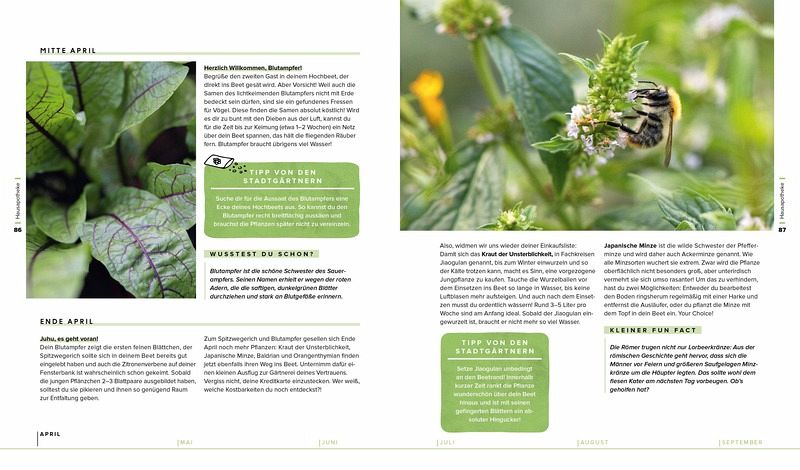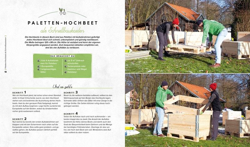Ernteglück aus dem Hochbeet - Verwandel Garten, Balkon und Terrasse in eine grüne Wohlfühloase! In ihren Büchern bieten Die Stadtgärtner allen Selbstversorger-Fans die perfekte Anleitung, um das Hochbeet das ganze Jahr hindurch perfekt zu nutzen. Von Bau und Anlage des Hochbeets bis hin zu Aussaat und Pflege wird alles anschaulich erklärt. Wer neben dem Hochbeet-Projekt auch andere DIY-Projekte im eigenen Garten umsetzen möchte, kommt ebenfalls auf seine Kosten. Vom vertikalen Gartenund Paletten-Hängebett bis zu Insektenhotel, Kinderwippe und Co. ist alles mit dabei! Die Schritt-für-Schritt-Anleitungen mit Fotos sind ideal für Einsteiger*innen und machen das Werken und Bauen für Garten und Balkon mit Paletten, Obstkisten und Co. gelingsicher! * 3 Bücherzu Palettenrahmen-Hochbeeten & Co. in einem Set * Der perfekte Start in den Hochbeet-Bau und den Anbau von Gemüse * Mit kreativen Projekten, Bauanleitungen, Beetplänen, Saisonkalender & Co. * Für alle, die nicht genug vom Hochbeet-gärtnern bekommen oder ganz neu starten wollen * Über 40 Selbermachprojekte für Balkon, Terrasse und Garten * Ultimative Ideen für dein neues Wohlfühl-Outdoor-Wohnzimmer Das Hochbeet ist auch für schlecht bepflanzbare Gärten oder Balkone ideal geeignet, man kann es angenehm im Stehen bearbeiten, und durch das in sich geschlossene Schicht-System kann die Aussaat früher als im Freibeet beginnen. Genießer*innen können sich Beete zu Themen wie "Grillmeister", "Salatglück" oder "Kleiner Italiener" anlegen, die das ganze Jahr frische Produkte liefern. Die Pflanzpläne werden mit stimmungsvollen Schritt-für-Schritt-Fotos detailliert erklärt.