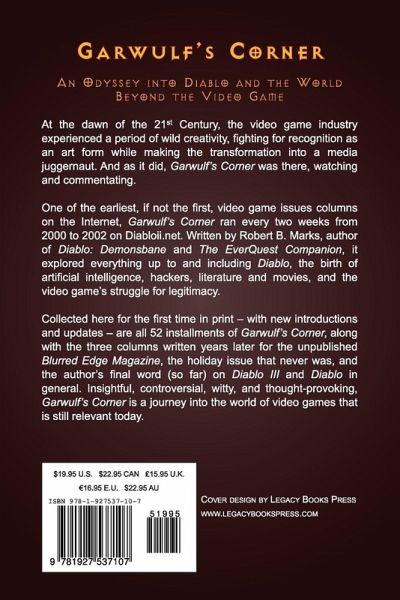 At the dawn of the 21st Century, the video game industry experienced a period of wild creativity, fighting for recognition as an art form while making the transformation into a media juggernaut. And as it did, Garwulf's Corner was there, watching and commentating. One of the earliest, if not the first, video game issues columns on the Internet, Garwulf's Corner ran every two weeks from 2000 to 2002 on Diabloii.net. Written by Robert B. Marks, author of Diablo: Demonsbane and The EverQuest Companion, it explored everything up to and including Diablo, the birth of artificial intelligence, hackers, literature and movies, and the video game's struggle for legitimacy. Collected here for the first time in print - with new introductions and updates - are all 52 installments of Garwulf's Corner, along with the three columns written years later for the unpublished Blurred Edge Magazine, the holiday issue that never was, and the author's final word (so far) on Diablo III and Diablo in general. Insightful, controversial, witty, and thought-provoking, Garwulf's Corner is a journey into the world of video games that is still relevant today.