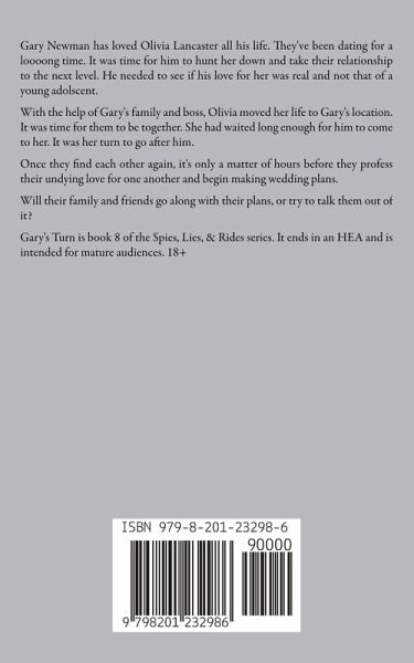 Gary Newman has loved Olivia Lancaster all his life. They've been dating for a loooong time. It was time for him to hunt her down and take their relationship to the next level. He needed to see if his love for her was real and not that of a young adolscent. With the help of Gary's family and boss, Olivia moved her life to Gary's location. It was time for them to be together. She had waited long enough for him to come to her. It was her turn to go after him. Once they find each other again, it's only a matter of hours before they profess their undying love for one another and begin making wedding plans. Will their family and friends go along with their plans, or try to talk them out of it? Gary's Turn is book 8 of the Spies, Lies, & Rides series. It ends in an HEA and is intended for mature audiences. 18+