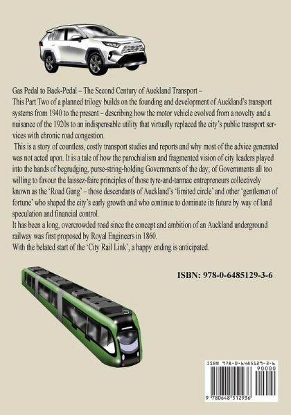 Gas Pedal to Back-Pedal - The Second Century of Auckland Transport - This is an historical narrative describing real persons and factual events that have resulted in the Auckland of today. There are many possible readers who might be interested in aspects of: Transport - the books contain a lot of history about trams, suburban rail, buses, ferries, and of course motor vehicles, and the legislation that has governed their operation. Politics - the books contain a good deal of information about the political and funding conflicts that have existed between central government and local government; between local government entities and each other; between public and private interests. This book illustrates how these conflicts often unduly influenced the decisions that were made and resulted in today's road congestion. City Planning - the books contain information about the successes and failures of central government and city planners and include descriptions of the many disconnects between transport and land use. Suburban Rail - the City Rail Link is to be completed soon - the books provide a complete narrative of why it took so long to fund and start a project first proposed as an essential undertaking more than a century ago. The number of studies and reports that were undertaken and ignored in that time is astounding. Reference Value - this book and its predecessor, Waka Paddle to Gas Pedal, are extensively and accurately referenced and indexed. The content is a comprehensive account - too comprehensive in parts - hence their length. The range of topics covered provides interest for all readers determined to learn how the workings of central and local governments have influenced an Aucklander's present environment and circumstances - whether it be the congested roads, the toxic atmosphere, or even the housing shortage. The content of this book is supported by my 12 years of study and research. This Part Two of a planned trilogy builds on the founding and development of Auckland's transport systems from 1940 to the present - describing how the motor vehicle evolved from a novelty and a nuisance of the 1920s to an indispensable utility that virtually replaced the city's public transport services with chronic road congestion. This is a story of countless, costly transport studies and reports and why most of the advice generated was not acted upon. It is a tale of how the parochialism and fragmented vision of city leaders played into the hands of begrudging, purse-string-holding Governments of the day; of Governments all too willing to favour the laissez-faire principles of those tyre-and-tarmac entrepreneurs collectively known as the 'Road Gang' - those descendants of Auckland's 'limited circle' and other 'gentlemen of fortune' who shaped the city's early growth and who continue to dominate its future by way of land speculation and financial control. It has been a long, overcrowded road since the concept and ambition of an Auckland underground railway was first proposed by Royal Engineers in 1860. With the belated start of the 'City Rail Link', a happy ending is anticipated.