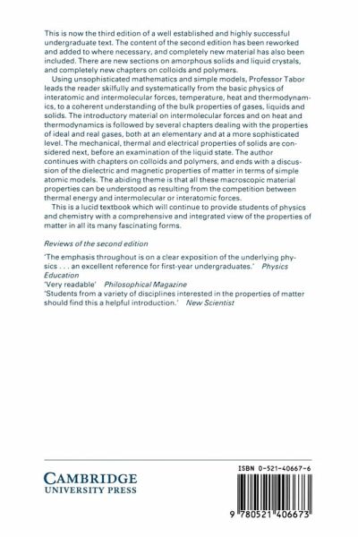 This is the third edition of a well-established and highly successful undergraduate text. The content of the second edition has been reworked and added to wherever necessary. There are new sections on amorphous solids and liquid crystals, and completely new chapters on colloids and polymers. Using elementary mathematics and simple models, Professor Tabor leads the reader skillfully and systematically from the basic physics of interatomic and intermolecular forces, temperature, heat and thermodynamics, to a coherent understanding of the bulk properties of gases, liquids, solids, liquid crystals, colloids, and polymers. The abiding theme is that all these macroscopic material properties can be understood as the result of the competition between thermal energy and intermolecular or interatomic forces.