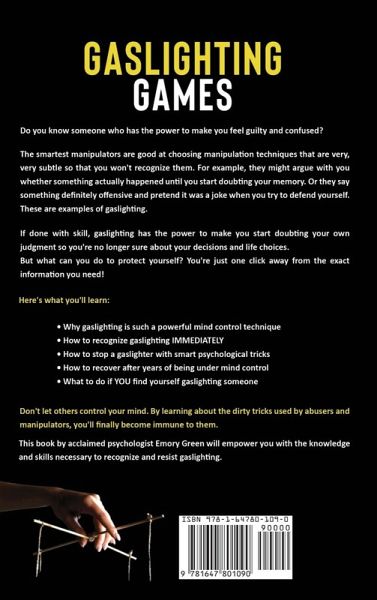 You're Being Manipulated Without Knowing It - Here's How To Recognize Gaslighting! Do you know someone who has the power to make you feel guilty and confused? It may be a parent, a romantic partner, or a co-worker. They're not saying anything that sounds offensive on the surface, but deep inside, their words make you feel terrible. Something is definitely wrong, but you can't put a finger on it - and when you try to talk to that person about how you feel, they just say you're making things up. If you can relate to this, continue reading! This mind game is more common and more dangerous than you think. You see, our intuition never lies. If something about a person's words or actions feels "off", they may very well be a toxic personality who's manipulating you into guilt and obedience. The smartest manipulators are good at choosing manipulation techniques that are very, very subtle so that you won't recognize them as abuse. For example, they might argue with you whether something actually happened until you start doubting your memory. Or they say something definitely offensive and pretend it was a joke when you try to defend yourself. These are examples of gaslighting. Gaslighting means saying things that make you question your memory and your perception of reality. If done with skill, gaslighting has the power to make you feel like a worthless person who can never, ever get anything right. You start doubting your own judgment so you're no longer sure about your decisions and life choices. You feel weak and confused - and in this state of mind, you're easy prey to any emotional abuser. But what can you do to protect yourself? You're just one click away from the exact information you need! This book by acclaimed psychologist Emory Green will empower you with the knowledge and skills necessary to recognize and resist gaslighting. Here's what you'll learn:Why gaslighting is such a powerful mind control technique How to recognize gaslighting IMMEDIATELY How gaslighting is used to conceal other manipulative mind games How to stop a gaslighter with smart psychological tricks How to recover after years of being under mind control What to do if YOU find yourself gaslighting someone And much more! Gaslighting is more serious than you think - even if your abuser says that "you're making everything up". Trust yourself and use the smart strategies presented in this book to confront the gaslighters around you and rebuild your self-esteem - if you don't break free now, you risk staying under your abuser's control for many, many years. Don't let others control your mind. By learning about the dirty tricks used by abusers and manipulators, you'll finally become immune to them. Get this eye-opening book now and protect yourself against emotional abuse. Scroll up, click the "Buy Now With 1-Click" button and Get Your Copy Now