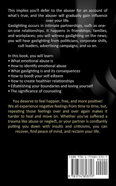 This implies you'll defer to the abuser for an account of what's true, and the abuser will gradually gain influence over your life. Gaslighting occurs in intimate partnerships, such as one-on-one relationships. It happens in friendships, families, and workplaces; you will witness gaslighting on the news; you will hear gaslighting from politicians, corporate shills, cult leaders, advertising campaigns, and so on. In this book, you will learn: ¿ What emotional abuse is ¿ How to identify emotional abuse ¿ What gaslighting is and its consequences ¿ How to boost your self-esteem ¿ How to create healthier relationships ¿ Establishing your boundaries and loving yourself ¿ The significance of counseling You deserve to feel happier, free, and more positive! We all experience negative feelings from time to time, but, repeating those feelings over and over again makes it harder to heal and move on. Whether you've suffered a trauma like abuse or neglect, or your partner is constantly putting you down with insults and criticisms, you can recover, find peace of mind, and reclaim your life.