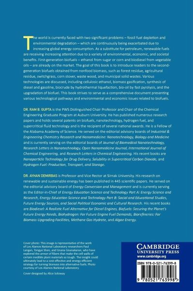 1. Introduction 2. Air pollution and global warming from the use of fossil fuels 3. Renewable energy sources 4. Biomass availability in the world 5. Conventional ethanol production from corn and sugarcane 6. Ethanol from biomass by fermentation 7. Biodiesel from vegetable oils 8. Diesel from biomass gasification followed by FT synthesis 9. Bio-oil from biomass pyrolysis 10. Bio-crude from biomass hydrothermal liquefaction 11. Solar and wind energy for biofuel production 12. Environmental impacts of biofuels 13. Economic impact of biofuels 14. Biofuel policy.