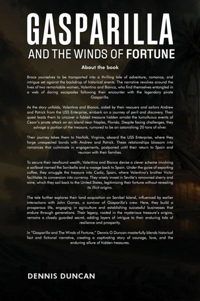 Brace yourselves to be transported into a thrilling tale of adventure, romance, and intrigue set against the backdrop of historical events. The narrative revolves around the lives of two remarkable women, Valentina and Bianca, who find themselves entangled in a web of daring escapades following their encounter with the legendary pirate Gasparilla. As the story unfolds, Valentina and Bianca, aided by their rescuers and sailors Andrew and Patrick from the USS Enterprise, embark on a journey of peril and discovery. Their quest leads them to uncover a fabled treasure hidden amidst the tumultuous events of Cezar's pirate attack on an island near Naples, Florida. Despite facing challenges, they salvage a portion of the treasure, rumored to be an astonishing 20 tons of silver. Their journey takes them to Norfolk, Virginia, aboard the USS Enterprise, where they forge unexpected bonds with Andrew and Patrick. These relationships blossom into romances that culminate in engagements, postponed until their return to Spain and reunion with their families. To secure their newfound wealth, Valentina and Bianca devise a clever scheme involving a sailboat named the Sanibella and a voyage back to Spain. Under the guise of exporting coffee, they smuggle the treasure into Cadiz, Spain, where Valentina's brother Victor facilitates its conversion into currency. They wisely invest in Seville's renowned sherry and wine, which they sail back to the United States, legitimizing their fortune without revealing its illicit origins. The tale further explores their land acquisition on Sanibel Island, influenced by earlier interactions with John Gomez, a survivor of Gasparilla's crew. Here, they build a prosperous life, engaging in agriculture and establishing successful businesses that endure through generations. Their legacy, rooted in the mysterious treasure's origins, remains a closely guarded secret, adding layers of intrigue to their enduring tale of resilience and prosperity.