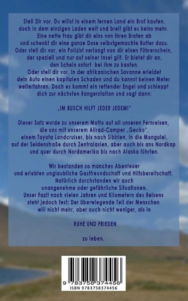 Stell Dir vor, Du willst in einem fernen Land ein Brot kaufen, doch in dem einzigen Laden weit und breit gibt es keins mehr. Eine nette Frau gibt dir eins von ihren Broten ab und schenkt dir eine ganze Dose selbstgemachte Butter dazu.Oder stell dir vor, ein Polizist verlangt von dir einen Führerschein, der speziell und nur auf seiner Insel gilt. Er bietet dir an, den Schein sofort bei ihm zu kaufen.Oder stell dir vor, in der afrikanischen Savanne erleidet dein Auto einen kapitalen Schaden und du kannst keinen Meter weiterfahren. Doch es kommt ein rettender Engel und schleppt dich zur nächsten Rangerstationund sagt dann:"IM BUSCH HILFT JEDER JEDEM!"Dieser Satz wurde zu unserem Motto auf all unseren Fernreisen, die uns mit unserem Allrad-Camper "Gecko", einem Toyota Landcruiser, bis nach Sibirien, in die Mongolei, auf der Seidenstraße durch Zentralasien, aber auch bis ans Nordkap und quer durch Nordamerika bis nach Alaska führten.Wir bestanden so manches Abenteuer und erlebten unglaubliche Gastfreundschaft und Hilfsbereitschaft. Natürlich durchstanden wir auch unangenehme oder gefährliche Situationen.Unser Fazit nach vielen Jahren und Kilometern des Reisens steht jedoch fest: Der überwiegende Teil der Menschen will nicht mehr, aber auch nicht weniger, als in RUHE UND FRIEDENzu leben.