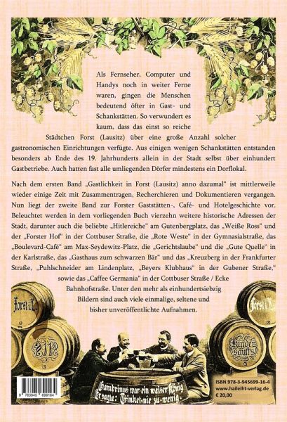 Nach fast dreißig Jahren des Zusammentragens von Sammelobjekten sowie mehreren Jahren Recherchierens und Dokumentierens liegt nun der zweite Band der Forster Gaststätten-, Café- und Hotelgeschichte vor. Anhand der umfangreichen Texte und unterstützt durch jede Menge historischer Aufnahmen kann der Leser nun detailgetreu nachvollziehen, wie in der Stadt Forst (Lausitz) früher gefeiert und getanzt, gebraten, gebacken und gekocht wurde. Beleuchtet werden vierzehn weitere historische Adressen der Stadt. Unter den mehr als einhundertsiebzig Bildern sind auch viele einmalige, seltene und bisher unveröffentlichte Aufnahmen.