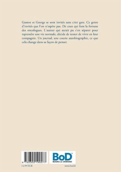 Gaston et George se sont invités sans crier gare. Ce genre d'invités que l'on n'espère pas. De ceux qui font la fortune des oncologues. L'auteur qui aurait pu s'en séparer pour reprendre une vie normale, décide de tenter de vivre en leur compagnie. Un journal, une courte autobiographie, ce que cela change dans sa façon de penser.