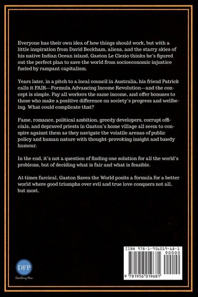 Everyone has their own idea of how things should work, but with a little inspiration from David Beckham, aliens, and the starry skies of his native Indian Ocean island, Gaston Le Clezio thinks he's figured out the perfect plan to save the world from socioeconomic injustice fueled by rampant capitalism. Years later, in a pitch to a local council in Australia, his friend Patrick calls it FAIR-Formula Advancing Income Revolution-and the concept is simple. Pay all workers the same income, and offer bonuses to those who make a positive difference on society's progress and wellbeing. What could complicate that? Fame, romance, political ambition, greedy developers, corrupt officials, and depraved priests in Gaston's home village all seem to conspire against them as they navigate the volatile arenas of public policy and human nature with thought-provoking insight and bawdy humour. In the end, it's not a question of finding one solution for all the world's problems, but of deciding what is fair and what is feasible. At times farcical, Gaston Saves the World posits a formula for a better world where good triumphs over evil and true love conquers not all, but most.