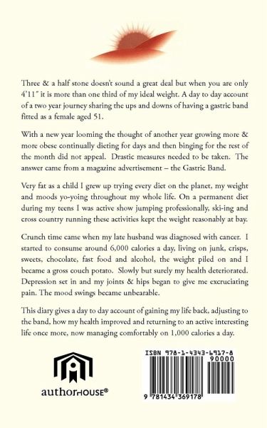 Three and a half stone doesn't sound a great deal but when you are only 4'11? it is more than one third of my ideal weight. A day to day account of a two year journey sharing the ups and downs of having a gastric band fitted as a female aged 51. With a new year looming the thought of another year growing more and more obese continually dieting for days and then binging for the rest of the month did not appeal. Drastic measures needed to be taken. The answer came from a magazine advertisement - the Gastric Band. Very fat as a child I grew up trying every diet on the planet, my weight and moods yo-yoing throughout my whole life. On a permanent diet during my teens I was active show jumping professionally, ski-ing and cross country running these activities kept the weight reasonably at bay. Crunch time came when my late husband was diagnosed with cancer. I started to consume around 6,000 calories a day, living on junk, crisps, sweets, chocolate, fast food and alcohol, the weight piled on and I became a gross couch potato. Slowly but surely my health deteriorated. Depression set in and my joints and hips began to give me excruciating pain. The mood swings became unbearable. This diary gives a day to day account of gaining my life back, adjusting to the band, how my health improved and returning to an active interesting life once more, now managing comfortably on 1,000 calories a day.