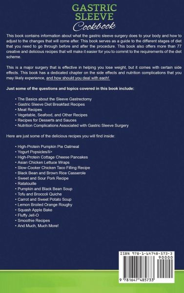 Over 77 Delicious and Healthy Gastric Sleeve Recipes with an Easy Guide to Being on the Gastric Sleeve Diet! This book contains information about what the gastric sleeve surgery does to your body and how to adjust to the changes that will come after. This book serves as a guide to the different stages of diet that you need to go through before and after the procedure. This book also offers more than 77 creative and delicious recipes that will make it easier for you to commit to the requirements of the diet scheme. This is a major surgery that is effective in helping you lose weight, but it comes with certain side effects. This book has a dedicated chapter on the side effects and nutrition complications that you may likely experience, and how should you deal with each! Just some of the questions and topics covered in this book include: The Basics about the Sleeve Gastrectomy Gastric Sleeve Diet Breakfast Recipes Meat Recipes Vegetable, Seafood, and Other Recipes Recipes for Desserts and Sauces Nutrition Complications Associated with Gastric Sleeve Surgery Here are just some of the delicious recipes you will find inside: High-Protein Pumpkin Pie Oatmeal Yogurt Popsicles High-Protein Cottage Cheese Pancakes Asian Chicken Lettuce Wraps Slow-Cooker Chicken Taco Filling Recipe Black Bean and Brown Rice Casserole Sweet and Sour Pork Recipe Ratatouille Pumpkin and Black Bean Soup Tofu and Broccoli Quiche Carrot and Sweet Potato Soup Lemon Broiled Orange Roughy Squash Apple Bake Fluffy Jell-O Smoothie Recipes And Much, Much More! Take Action Now and Get Your Copy of this Comprehensive book Today!