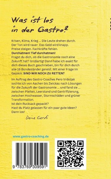 WAS IST LOS IN DER GASTRO? Krisen, Klima, Krieg ... Die Leute drehen durch. Der Ton wird rauer. Das Geld wird knapp. Preise steigen. Fachkräfte fehlen. Durchatmen! Tief durchatmen! Fragst du dich, ob die Gastronomie noch eine Zukunft hat? Großartig! Dann habe ich exakt für dich dieses Buch geschrieben, bin für dich durch alle 16 Bundesländer gereist. Mit einer Frage im Gepäck: SIND WIR NOCH ZU RETTEN? Im Auftrag des Gastro-Coaches Pero Vrdoljak suchte ich von Aachen bis Zwickau nach Lösungen für die Zukunft der Gastro-nomie ... und fand sie ... zwischen Pleiten, Leerstand und Gentrifi-zierung, zwischen Hochwasser, Sturmschäden und grüner Trans-formation. Ist dein Rucksack gepackt? Hast du Platz gelassen für ein paar gute Ideen? Dann los! Deine Gerdi