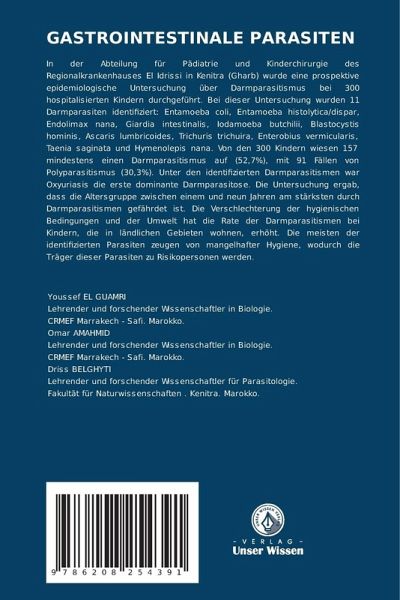 In der Abteilung für Pädiatrie und Kinderchirurgie des Regionalkrankenhauses El Idrissi in Kenitra (Gharb) wurde eine prospektive epidemiologische Untersuchung über Darmparasitismus bei 300 hospitalisierten Kindern durchgeführt. Bei dieser Untersuchung wurden 11 Darmparasiten identifiziert: Entamoeba coli, Entamoeba histolytica/dispar, Endolimax nana, Giardia intestinalis, Iodamoeba butchilii, Blastocystis hominis, Ascaris lumbricoides, Trichuris trichuira, Enterobius vermicularis, Taenia saginata und Hymenolepis nana. Von den 300 Kindern wiesen 157 mindestens einen Darmparasitismus auf (52,7%), mit 91 Fällen von Polyparasitismus (30,3%). Unter den identifizierten Darmparasitismen war Oxyuriasis die erste dominante Darmparasitose. Die Untersuchung ergab, dass die Altersgruppe zwischen einem und neun Jahren am stärksten durch Darmparasitismen gefährdet ist. Die Verschlechterung der hygienischen Bedingungen und der Umwelt hat die Rate der Darmparasitismen bei Kindern, die in ländlichen Gebieten wohnen, erhöht. Die meisten der identifizierten Parasiten zeugen von mangelhafter Hygiene, wodurch die Träger dieser Parasiten zu Risikopersonen werden.