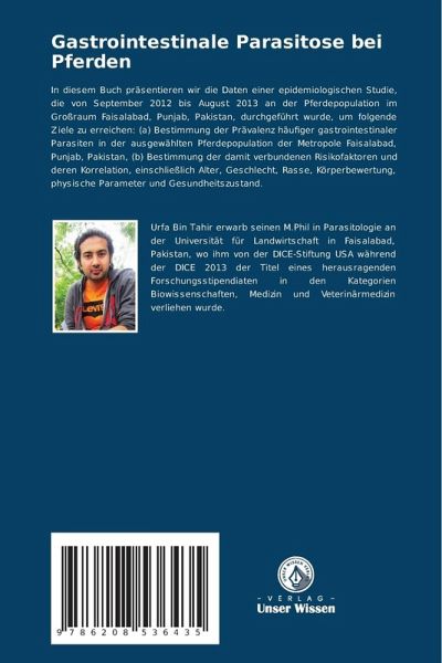 In diesem Buch präsentieren wir die Daten einer epidemiologischen Studie, die von September 2012 bis August 2013 an der Pferdepopulation im Großraum Faisalabad, Punjab, Pakistan, durchgeführt wurde, um folgende Ziele zu erreichen: (a) Bestimmung der Prävalenz häufiger gastrointestinaler Parasiten in der ausgewählten Pferdepopulation der Metropole Faisalabad, Punjab, Pakistan, (b) Bestimmung der damit verbundenen Risikofaktoren und deren Korrelation, einschließlich Alter, Geschlecht, Rasse, Körperbewertung, physische Parameter und Gesundheitszustand.