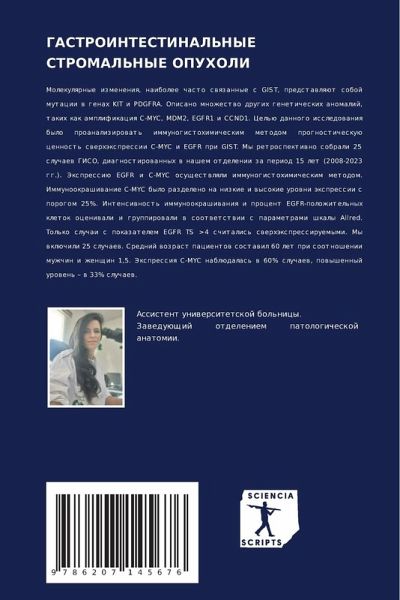 Molekulqrnye izmeneniq, naibolee chasto swqzannye s GIST, predstawlqüt soboj mutacii w genah KIT i PDGFRA. Opisano mnozhestwo drugih geneticheskih anomalij, takih kak amplifikaciq C-MYC, MDM2, EGFR1 i CCND1. Cel'ü dannogo issledowaniq bylo proanalizirowat' immunogistohimicheskim metodom prognosticheskuü cennost' swerhäxpressii C-MYC i EGFR pri GIST. My retrospektiwno sobrali 25 sluchaew GISO, diagnostirowannyh w nashem otdelenii za period 15 let (2008-2023 gg.). Jexpressiü EGFR i C-MYC osuschestwlqli immunogistohimicheskim metodom. Immunookrashiwanie C-MYC bylo razdeleno na nizkie i wysokie urowni äxpressii s porogom 25%. Intensiwnost' immunookrashiwaniq i procent EGFR-polozhitel'nyh kletok oceniwali i gruppirowali w sootwetstwii s parametrami shkaly Allred. Tol'ko sluchai s pokazatelem EGFR TS >4 schitalis' swerhäxpressiruemymi. My wklüchili 25 sluchaew. Srednij wozrast pacientow sostawil 60 let pri sootnoshenii muzhchin i zhenschin 1,5. Jexpressiq C-MYC nablüdalas' w 60% sluchaew, powyshennyj urowen' ¿ w 33% sluchaew.